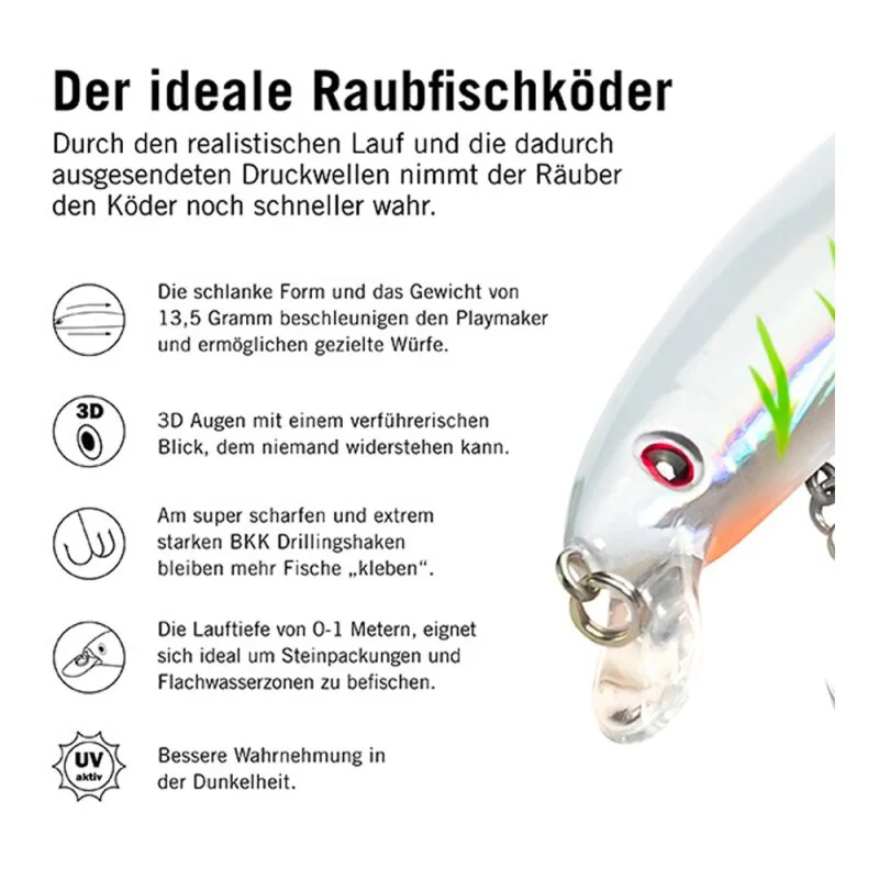 - Realistische Bauform : die Form des Playmaker Minnow Wobblers imitiert einen Brutfisch.
